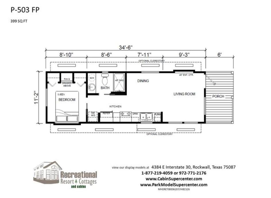 Please note: All pictures displayed may include added options. From time to time, available options and styles change. Some features shown in the pictures may no longer be available. Call1-877-219-4059 to discuss in detail or email us at sales@recreationalresortcottages.com