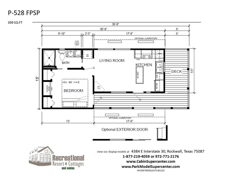 Please note: All pictures displayed may include added options. From time to time, available options and styles change. Some features shown in the pictures may no longer be available. Call1-877-219-4059 to discuss in detail or email us at sales@recreationalresortcottages.com