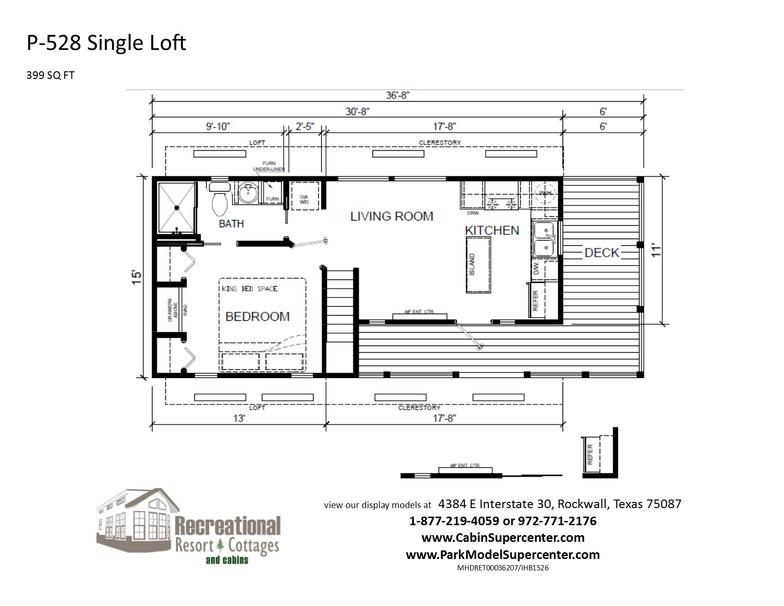 Please note: All pictures displayed may include added options. From time to time, available options and styles change. Some features shown in the pictures may no longer be available. Call1-877-219-4059 to discuss in detail or email us at sales@recreationalresortcottages.com