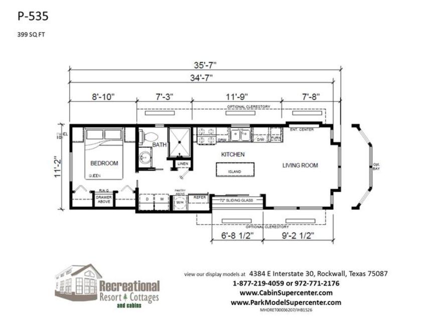 Please note: All pictures displayed may include added options. From time to time, available options and styles change. Some features shown in the pictures may no longer be available. Call1-877-219-4059 to discuss in detail or email us at sales@recreationalresortcottages.com