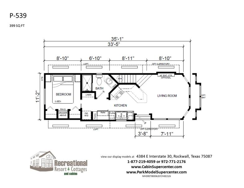 Please note: All pictures displayed may include added options. From time to time, available options and styles change. Some features shown in the pictures may no longer be available. Call1-877-219-4059 to discuss in detail or email us at sales@recreationalresortcottages.com