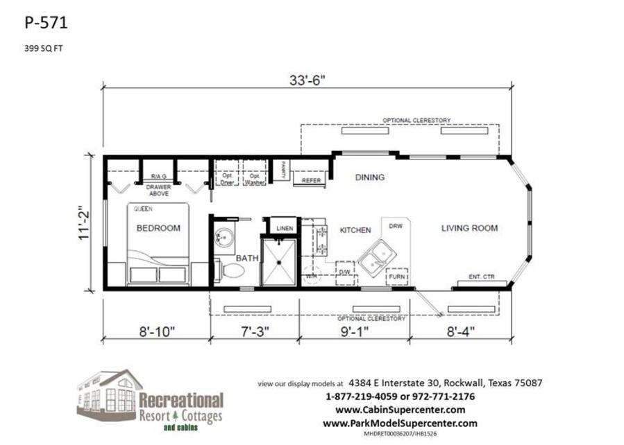 Please note: All pictures displayed may include added options. From time to time, available options and styles change. Some features shown in the pictures may no longer be available. Call1-877-219-4059 to discuss in detail or email us at sales@recreationalresortcottages.com