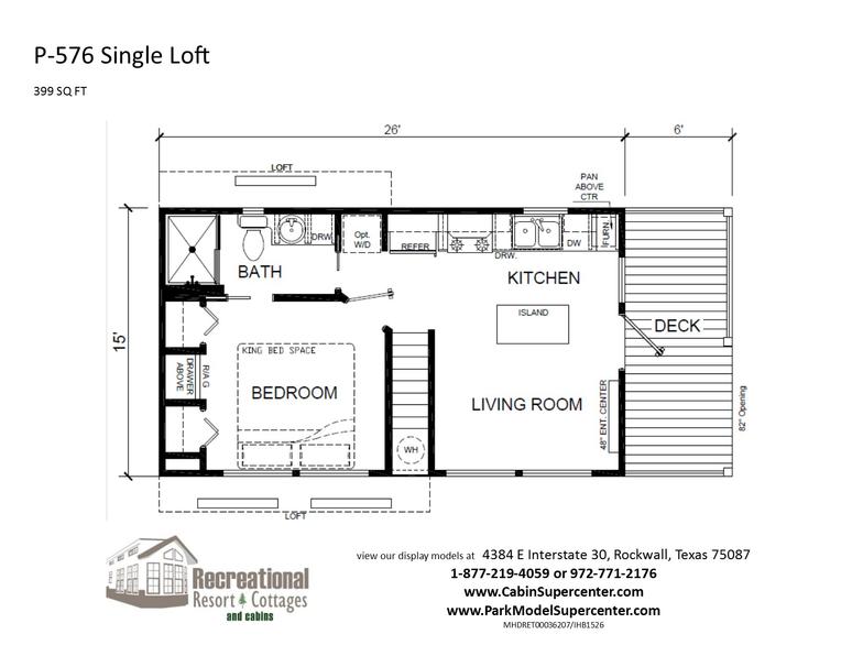 Please note: All pictures displayed may include added options. From time to time, available options and styles change. Some features shown in the pictures may no longer be available. Call1-877-219-4059 to discuss in detail or email us at sales@recreationalresortcottages.com